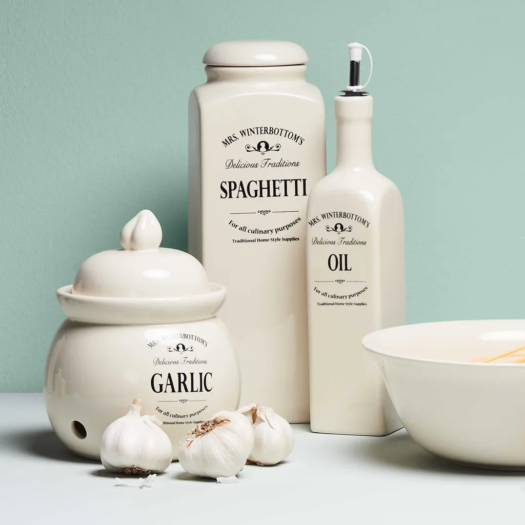 Mit diesem Knoblauchtopf im englischen Vintage Design bringen Sie Ordnung mit System in ihre Küche! Geräumig und stilvoll bietet der runde Behälter genügend Platz für die Knoblauch-Lagerung und das Aufbewahren anderer Vorräte. Die Lebensmittel bleiben im Vorratsbehälter länger haltbar, denn der Topf mit Deckel bietet Schutz vor Dreck, lagert alles ordentlich und trocken und passt zudem mit seiner Retro Form perfekt in typische Küchen im modernen oder Landhausstil.