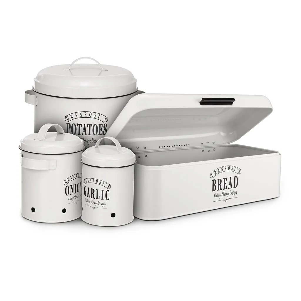 Die geräumigen Georgia Emaille-Vorratsboxen mit der Aufschrift „ONION“, „GARLIC“ und