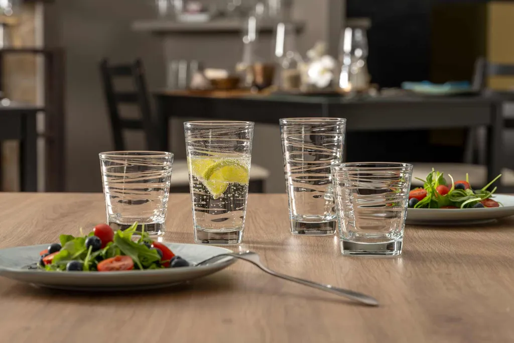Das Set besteht aus: 4x Trinkglas groß 280 ml, 4x Trinkglas klein 250 ml