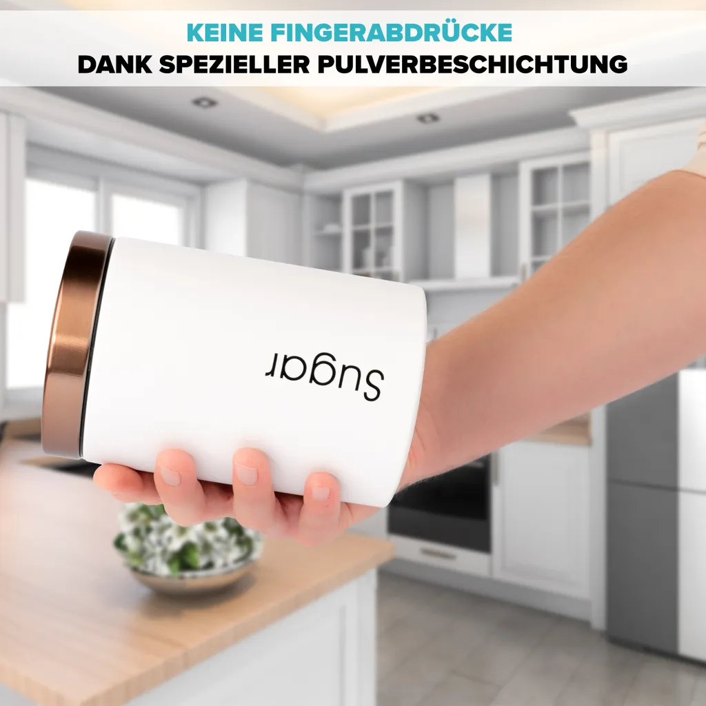 Die moderne Pulverbeschichtung und der polierte Edelstahldeckel verleihen den Vorratsdosen einen besonders edlen Look.