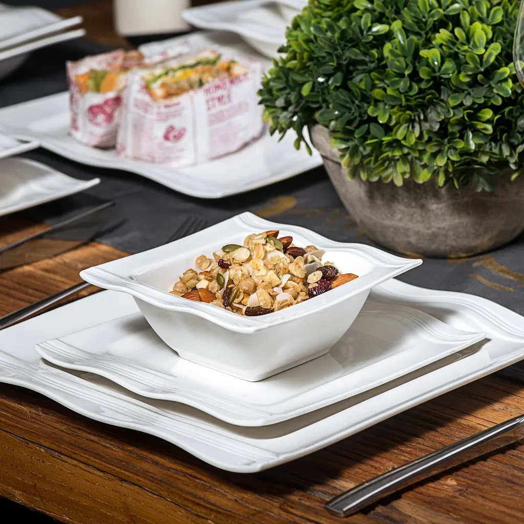 - MODERNES GESCHIRR MIT WELLENDESIGN AUS HOCHWERTIGEM PORZELLAN IN CREMEWEIß | Haben Sie genug von komplett eckigen Geschirrset? Malacasa Tafelgeschirr kann Sie immer wieder überraschen und lässt Sie nicht im Stich. Die seidig gewellten Kanten machen den klassischen quadratischen Teller edler, aber auch beruhigender. Serie Mario ist auch für ihr einzigartiges Design bekannt und von allen anerkannt, also, wenn Sie etwas Neues ausprobieren wollen, ist es keine schlechte Idee, diese Serie zu wählen.
