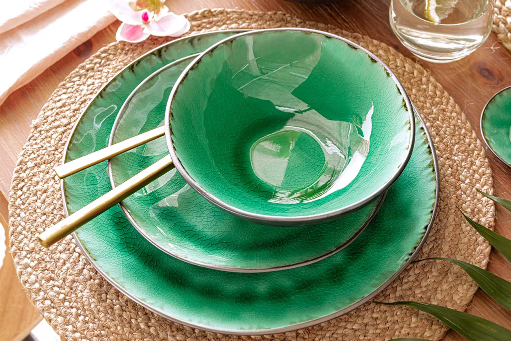 AUßERGEWÖHNLICHES DESIGN Durch die braunen Ränder sowie die türkisen und krakelierten Nutzflächen entsteht eine einzigartige Harmonie, welche einen unvergleichlichen Eindruck hinterlässt. Der Krakelee-Effekt, auch Reißlack genannt, zieht sich beim Trocknen zusammen, wobei sich ein Muster von Sprüngen bildet. Dieser Effekt gibt den Tellern eine ganz besondere tiefe und verleiht dem Tafelservice eine wundervolle Vintage Note