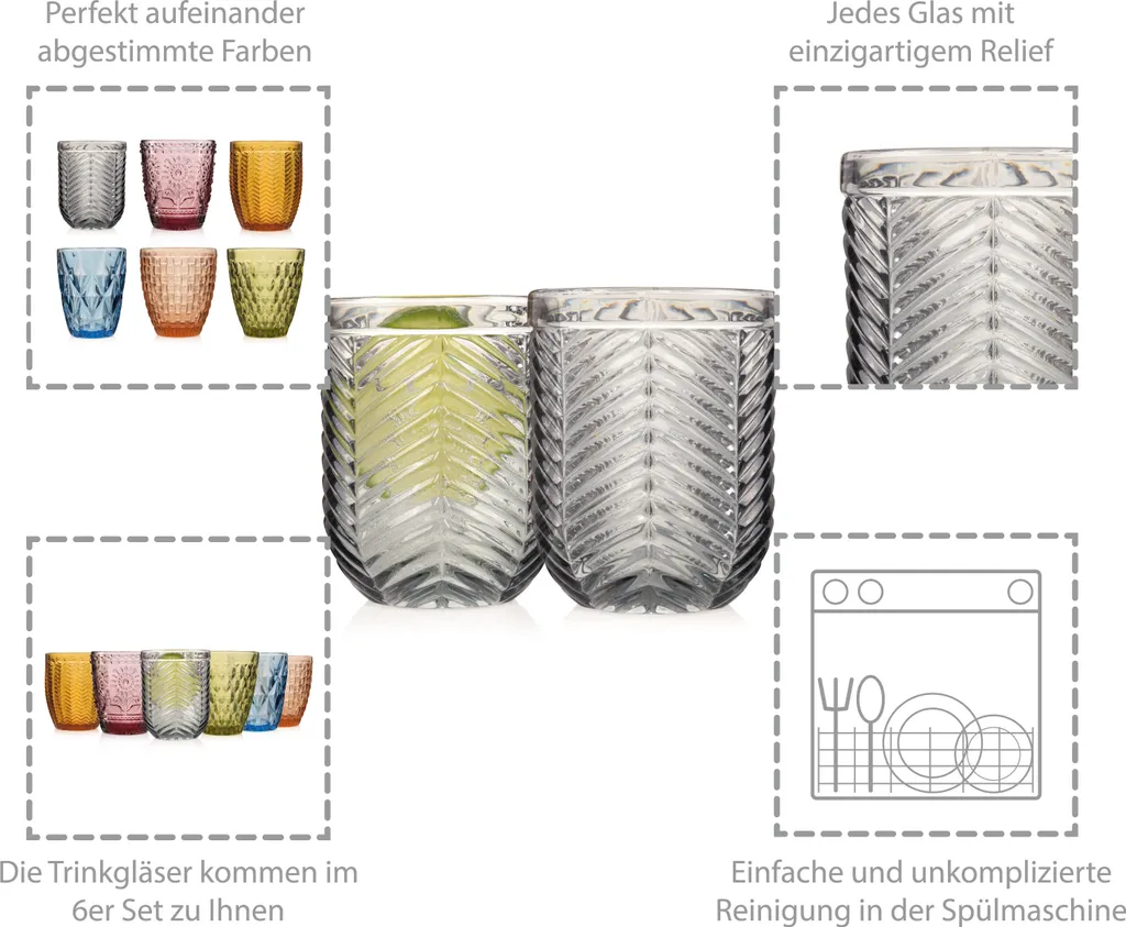 Moderne, bunte Trinkgläser, die aus einer anderen Zeit zu sein scheinen, in sechs, sorgfältig aufeinander abgestimmten Farben: Grün, Bernstein, Blau, Grau, Braun, und Lila werden Ihren gedeckten Tisch perfekt ergänzen. Dieses spülmaschinenfeste Wassergläser Set sieht nicht nur toll aus, es ist äußerst funktional, langlebig und robust