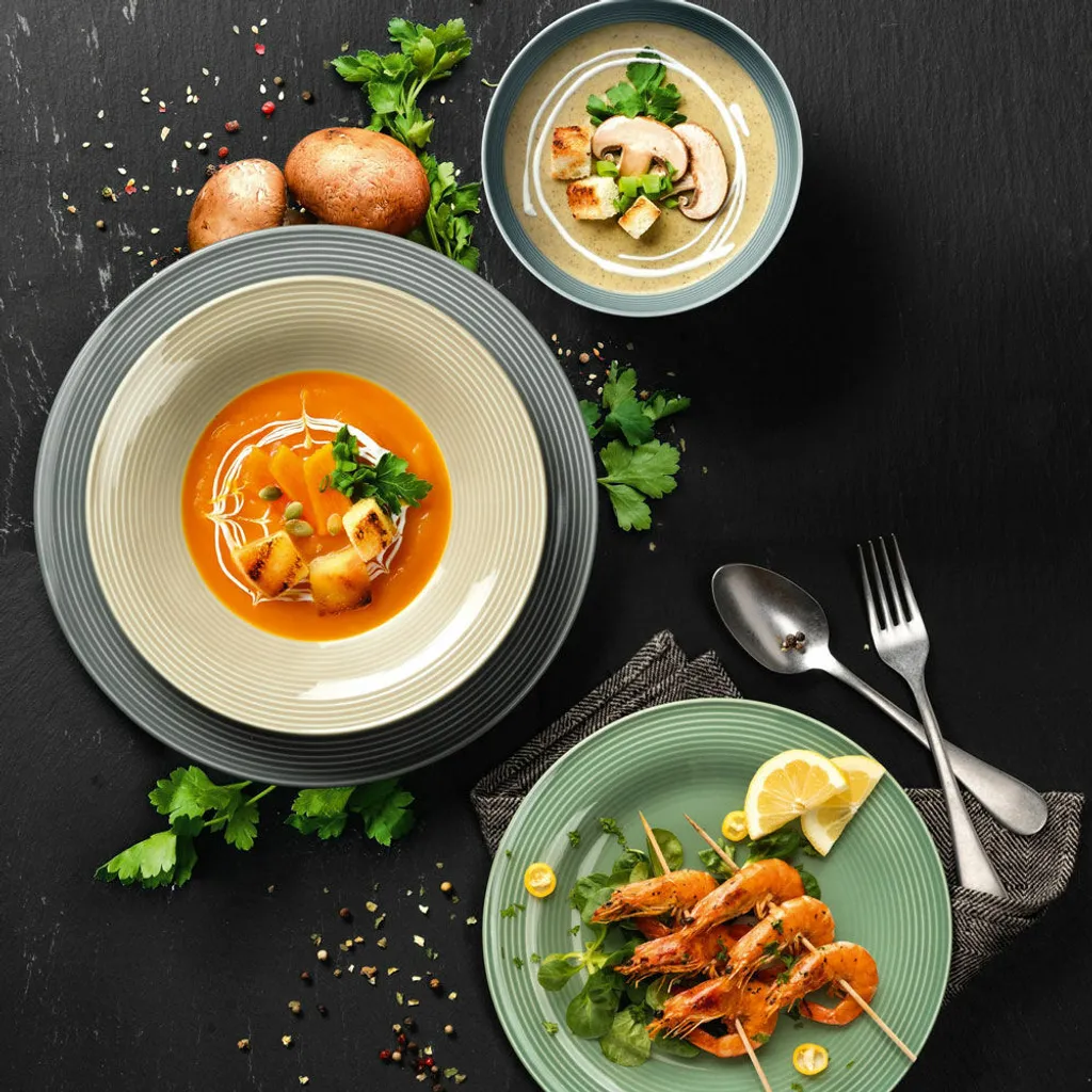 1. Wahl, Porzellan, spülmaschinenfest, mikrowellengeeignet, ofenfest. Das Set umfasst6x Suppenteller 22,5cm6x Speiseteller 27,5cm