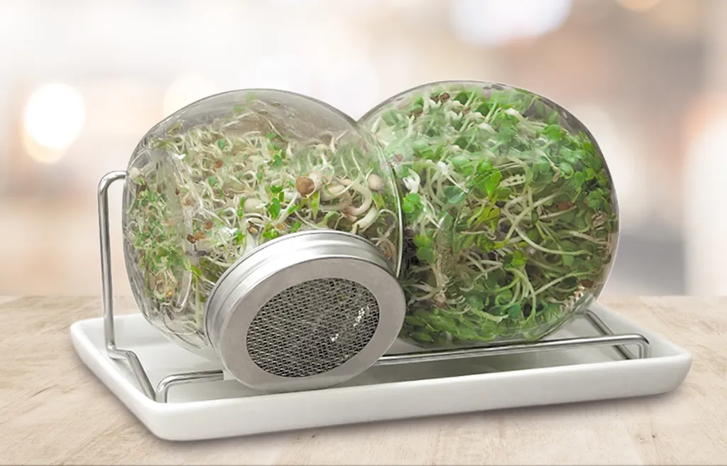 Möchten Sie Sprossen gleich im Doppelpack anbauen? Dann ist das Sprossenglas Duo Set ideal geeignet. Die schicken Gläser können Sie überall in der Küche oder dem Wohnzimmer platzieren. Die kleinen Power-Sprossen schmecken lecker aufs Brot, zum Salat und in vielen Gerichten.