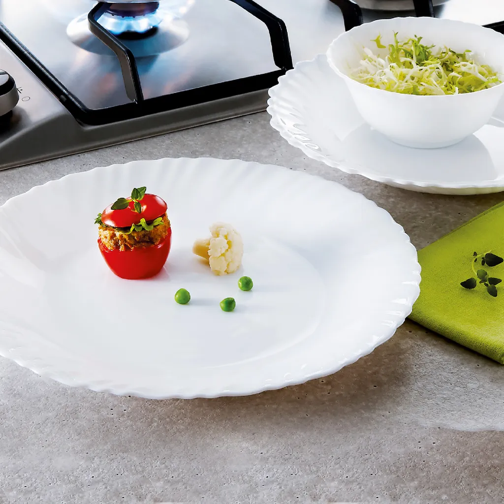 TRIANON – klassische und bekannteste Geschirrkollektion aus weißem Hartglas von Luminarc. Glas unterliegt einer thermischer Behandlung, die das Material härter und beständiger gegen Kratzen und Schläge macht. Hartglas ist glatt und porenfrei, daher hält es keine Mikroorganismen auf und ist 100% hygienisch.