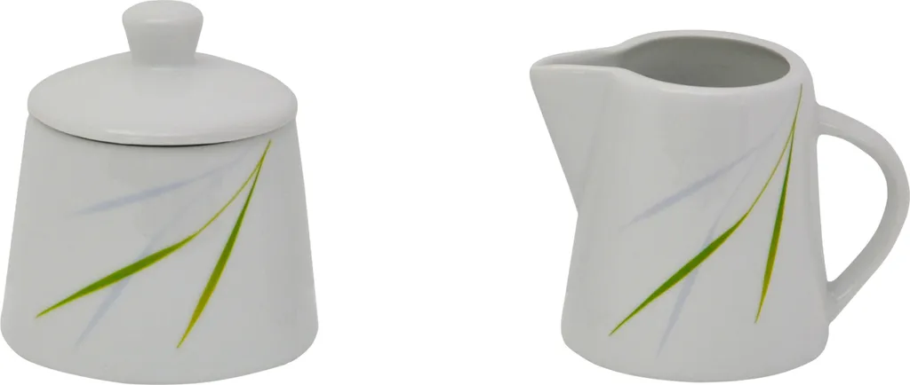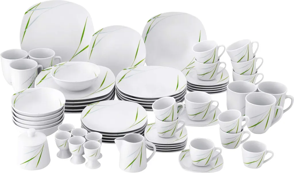 Dieses 62-teilige Kombiservice in eckiger Form ist weiß und mit einem Gräserdekor verziert. Das Porzellan ist spülmaschinen- und mikrowellengeeignet. Das Set beinhaltet einen Gießer, eine Zuckerdose, Tassen und Untertassen, Dessertteller, Essteller, Kaffe- und Eierbecher, Müslischalen sowie Espressotassen.