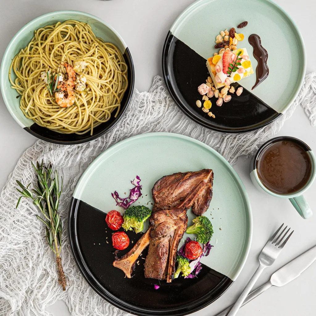 - 【Außerordentliches Design.】Aus hochwertigem und umweltfreundlichem Steinzeug ist das vancasso Ess Geschirrset von Hand gefertigt. Glatte und exquisite Glasur, stilvolle Mondschein Form, zweifarbiger Farbton-62% blaugrün mit 38% schwarz, ausgezeichnetes Design und elegantes modernes Aussehen entsteht eine einzigartige angenehme Harmonie.
