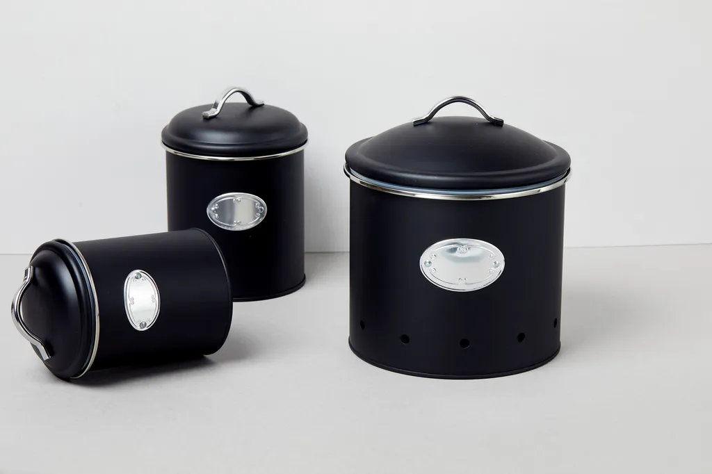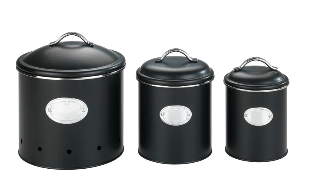Die praktischen Aufbewahrungsdosen Nero von WENKO sind aus lebensmittelechtem, schwarz lackiertem Metall gefertigt und bringen durch ihr Retro-Design einen nostalgischen Charme in die Küche. Ein silberfarbenes Schild aus Aluminium, das auf den Dosen angebracht ist, lässt sich leicht mit einem Stift beschriften, somit ist immer sichtbar, welche Lebensmittel sich in den Boxen befinden.